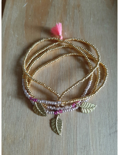 Multitude de perles Miyuki rocaille Doré, Rose mettalic , Rose tendre où argenté, blanc, doré & ses breloques Feuilles doré à l’or fin.