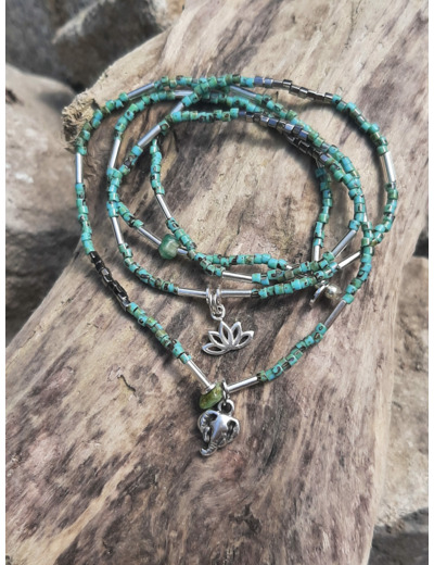Multitude de perles rocaille Argenté , Turquoise marbré, sa breloque fleur de lotus en argent 925, Tête d’éléphant en argent 925 et ses pierres semi naturelle en Amazonite