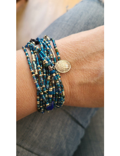 Multitude de perles tons bleu, translucide bleue/Green, bleue, argent, ( environ 1450), des facettes beige et bleu , à porter toute l’année .