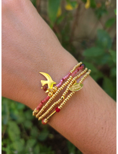 Multitude de perles Miyuki rocaille Doré et son pendentif HIRONDELLE en acier inoxydable et ses pierres naturelle ( quartz rose, rhodochrosite, turquoise africaine, pierre de lune, nacre, perle d’eau douce, grenat, Tourmaline, jaspe rouge)