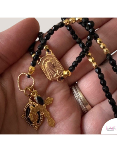 Composé de perles de verre facettés noires , gold effet 24k, nous terminons cette merveille par une croix gravée d’arabesque en argent doré à l’or fin, d’une médaille sainte en acier inoxydable et epoxy et de sa pierre zircon noir