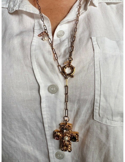 Une croix (acier inoxydable) sertie de zirconium teintés ambre, péridot, quartz rose, perle d’eau douce domine ce magnifique sautoir.