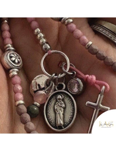 Ce chapelet possède une pièce centrale *Marie*, au centre et nous terminons cette merveille par une médaille en acier inox *religieuse* d’une pierre rose quartz, d’une croix en acier, petite medaille martelée croix fixé également sur un anneau en acier Inoxydable.