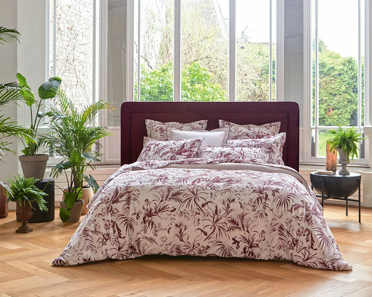 L’ambiance végétale tropicale luxuriante revisitée dans des tonalités de lie de vin nous inspire ce modèle Serre Exotique.