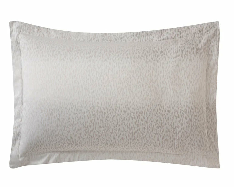 La face avant de la taie Caractère développe ce motif animalier comme un jeu de rayures horizontales en nuances de beige et de taupe. Au dos un satin uni nacre élégant parfait la taie.