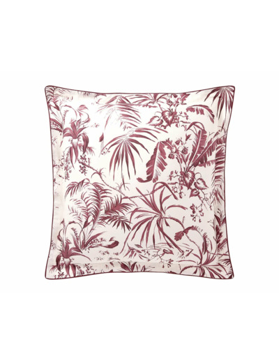 Résolument actuelle, la taie est confectionnée sur une percale de coton 80 fils/cm² et mixe une face végétale, une face d’une rayure pointillée, le tout paré d’un volant plat de 3cm et d’un biais coloris aubergine. Elle est disponible dans deux tailles : 50 x 75 et 65 x 65 cm.