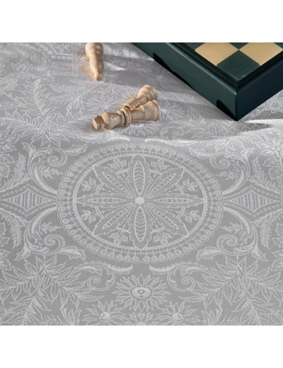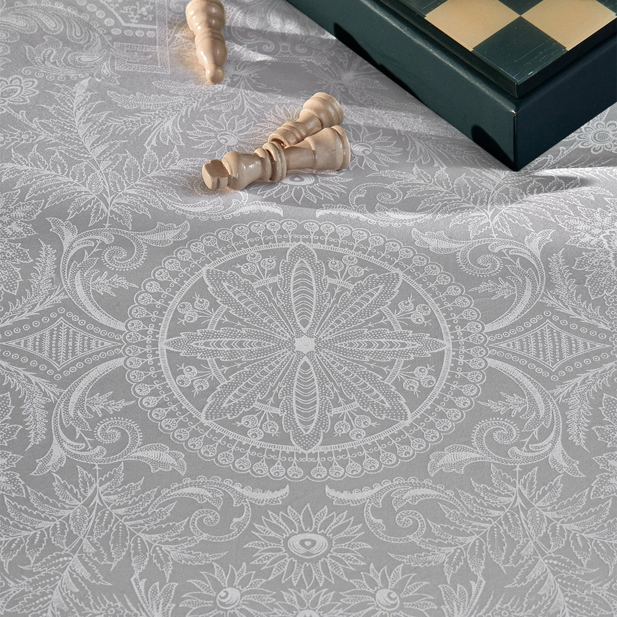 Drap plat imprimé sur satin de coton 120 fils/cm², 100% coton. Coton d'Egypte aux fibres très longues de qualité supérieure. Doux et soyeux, le satin donne à ce linge un aspect brillant et lisse. Motif ornemental all-over imprimé à l'encre mat blanche sur fond gris glacier.