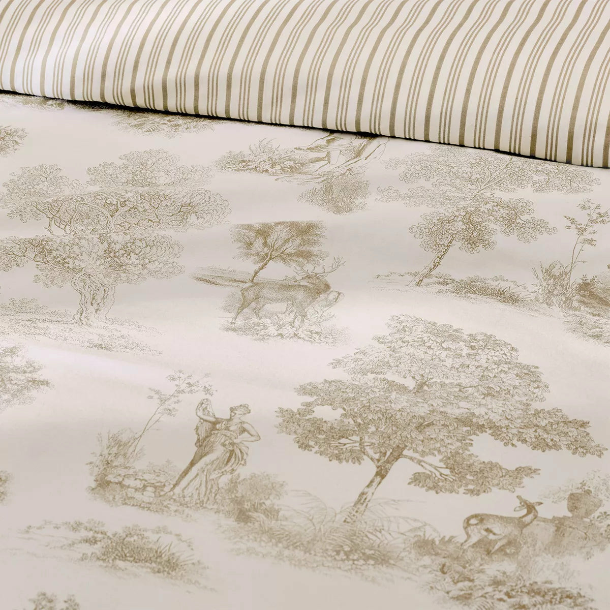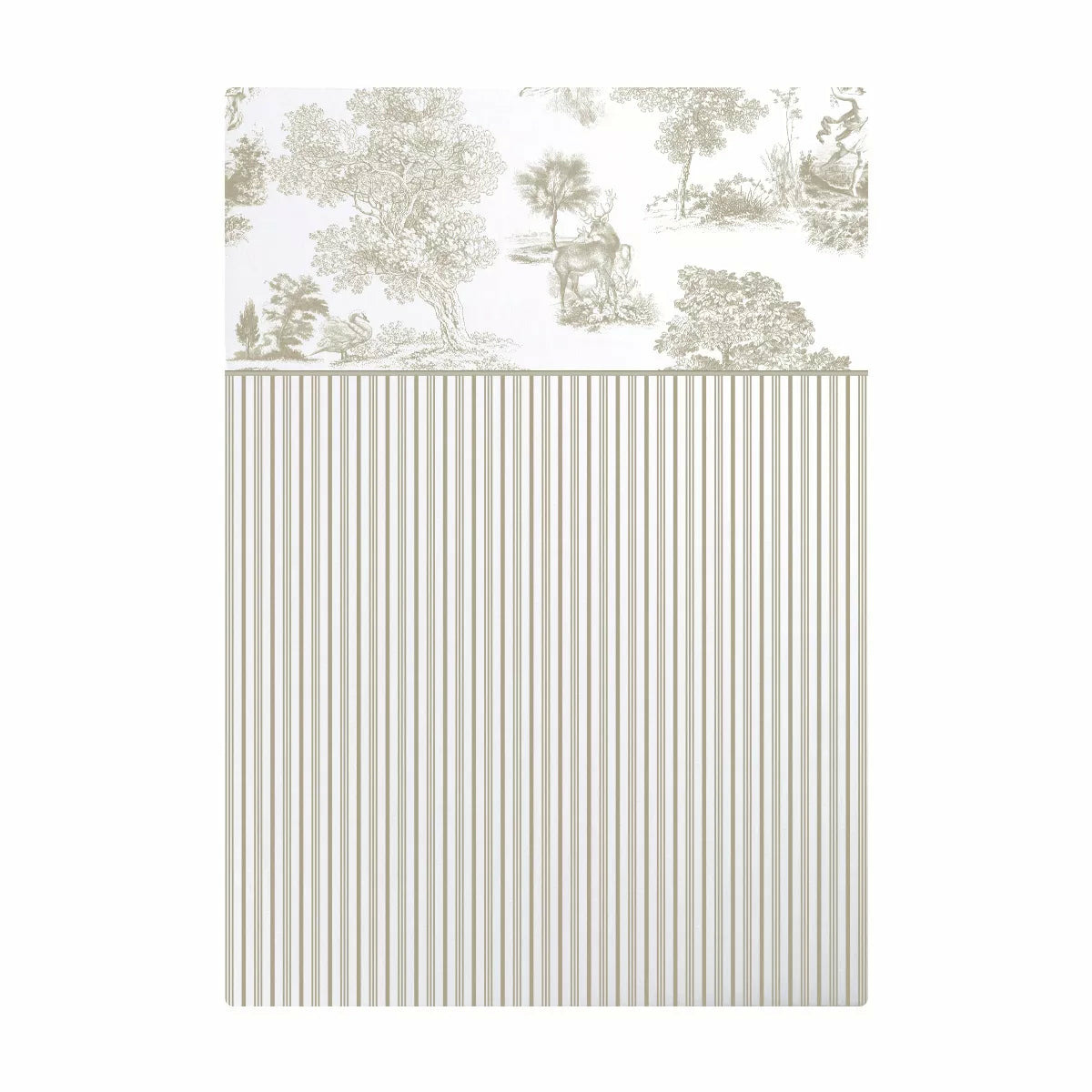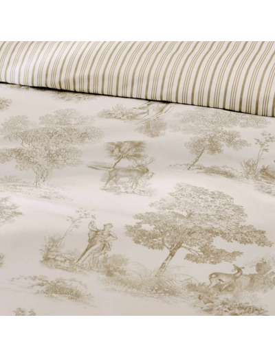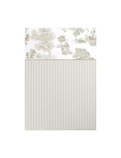 Drap plat imprimé en percale de coton 80 fils/cm², 100% coton. Rayures verticales sur le corps du drap et motifs de toile de Jouy imprimés en all over en haut du drap. Qualité made in France. Linge des Vosges.