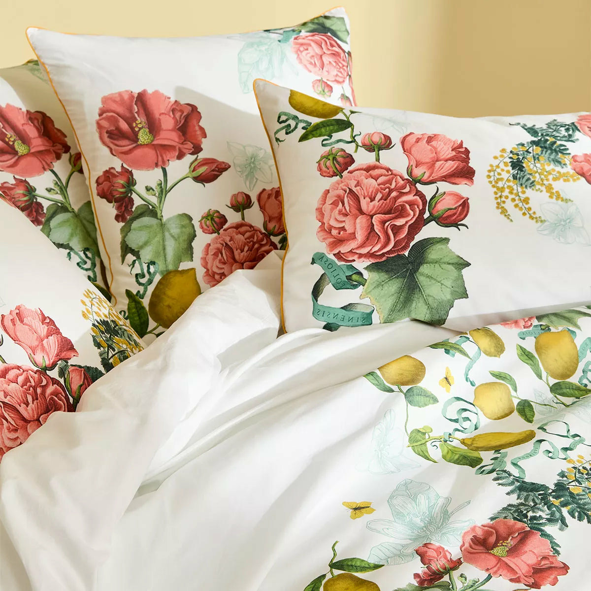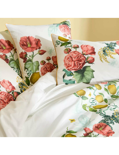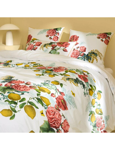 Housse de couette imprimée en percale de coton 80 fils/cm², 100% coton. Guirlandes de roses anciennes, d'hibiscus, de mimosas et de citrons dans un esprit de dolce vita vintage et intemporel. Verso en percale unie écrue. Produit prélavé : effet froissé permanent, repassage superflu.