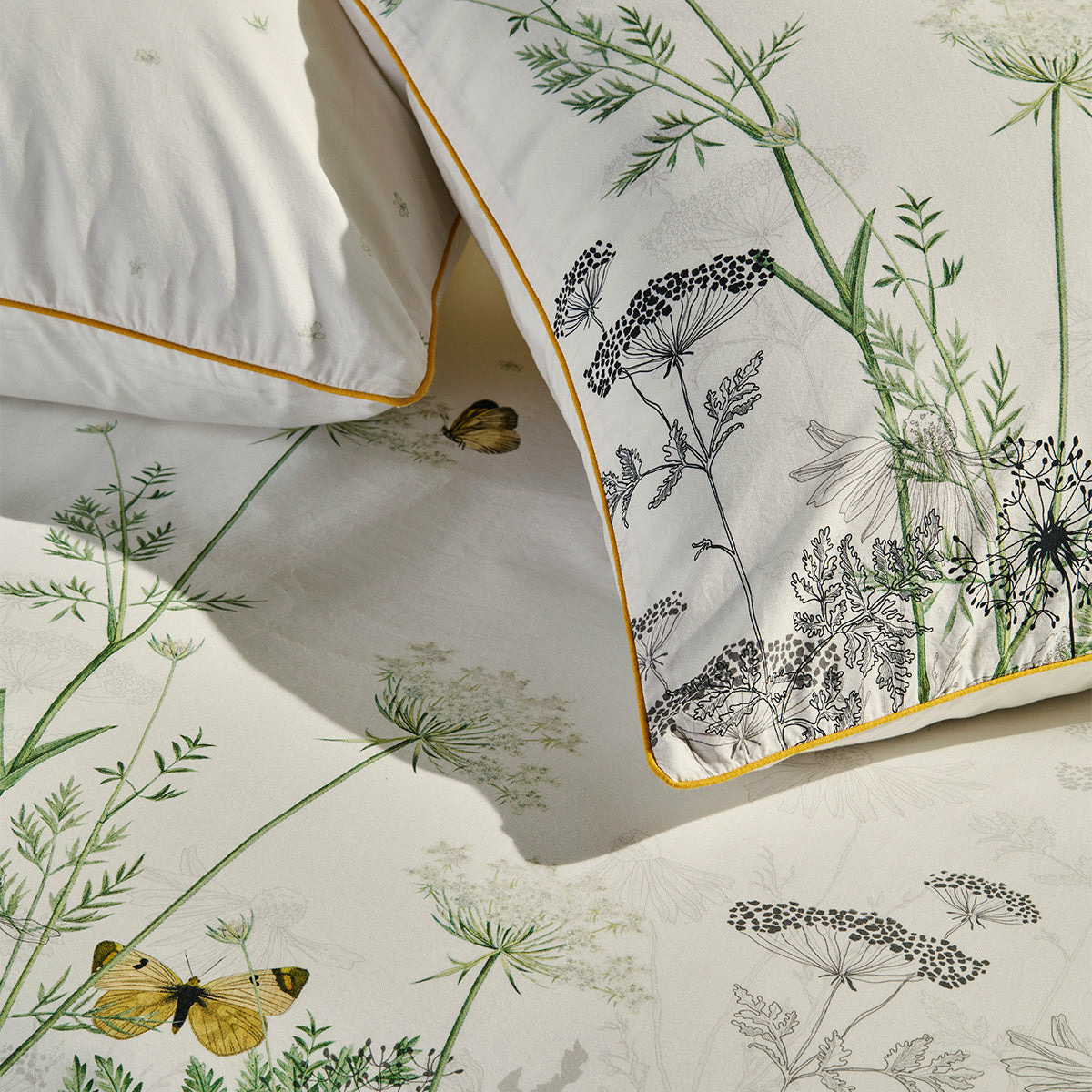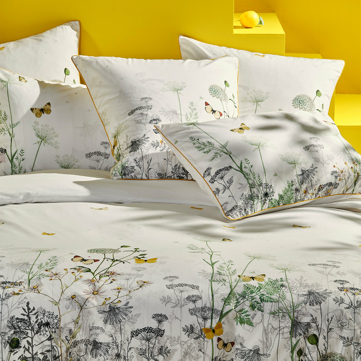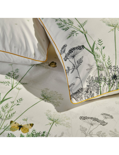 Housse de couette imprimée en percale de coton 80 fils/cm², 100% coton. Mélange de fleurs sauvages dessinées au trait et de fleurs colorées (motif linéaire). Verso en percale unie blanche. Produit prélavé : effet froissé permanent, repassage superflu.