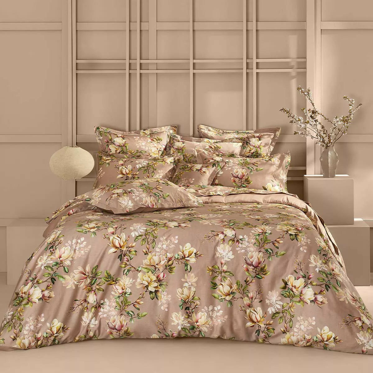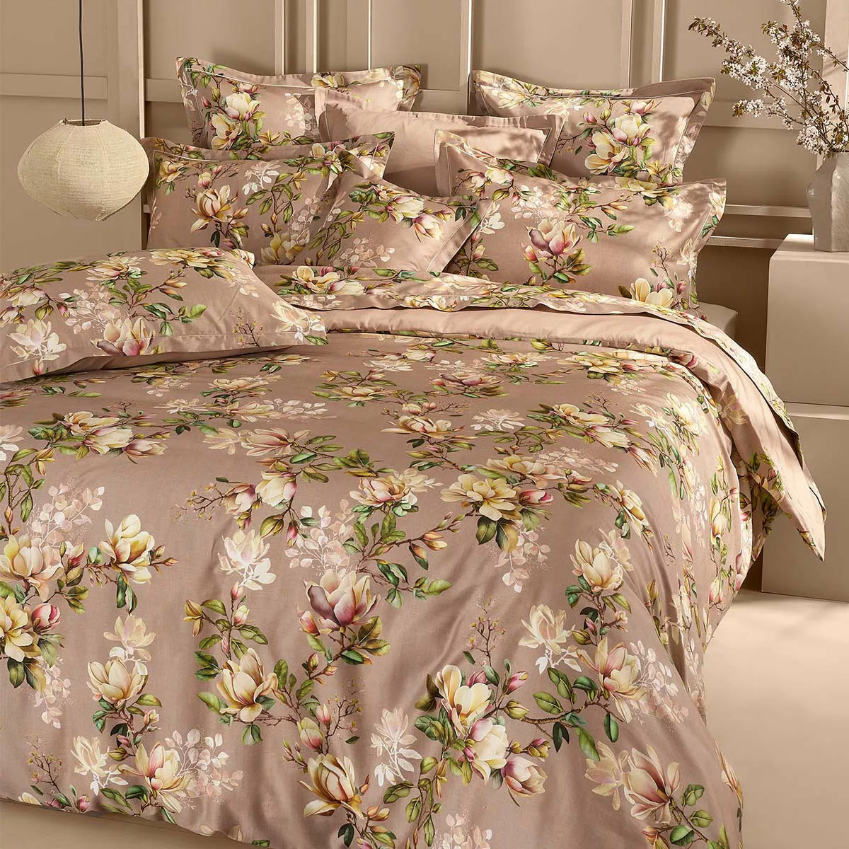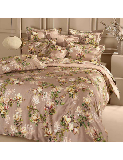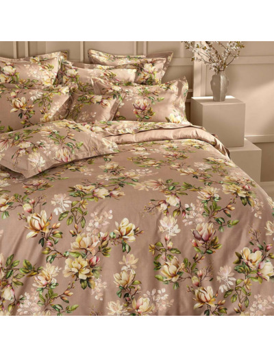 Housse de couette imprimée sur satin de coton 120 fils/cm², 100% coton, doux et soyeux. All-over de branches de magnolias aux tons poudrés et féminins.