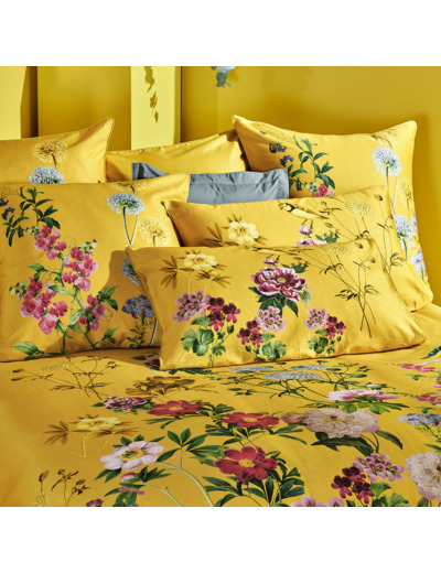 Housse de couette imprimée sur satin de coton 120 fils/cm², 100% coton, doux et soyeux. Motif placé de fleurs et d'oiseaux sur un fond curry doré; Verso satin Ava uni Curry.