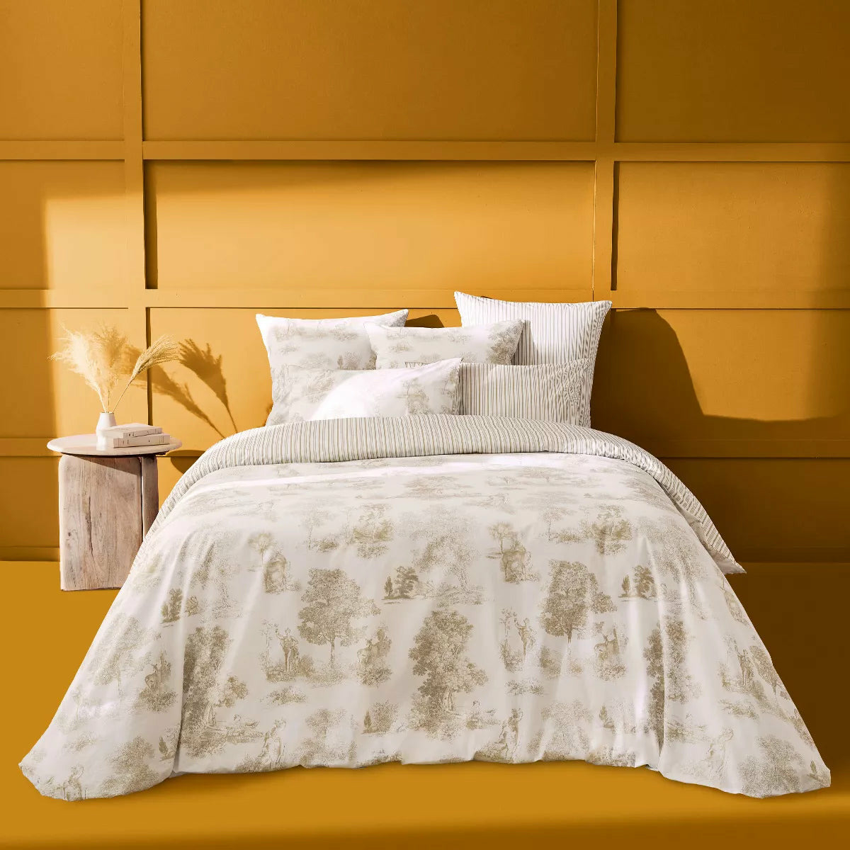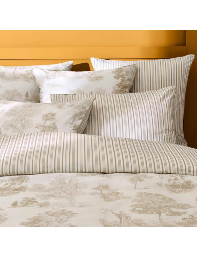 Housse de couette en percale de coton 80 fils/cm², 100% coton, avec motifs de toile de Jouy imprimés en all over. Rayures verticales au verso. Qualité made in France. Linge des Vosges.