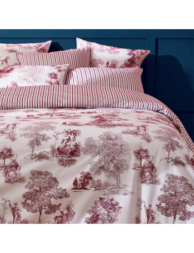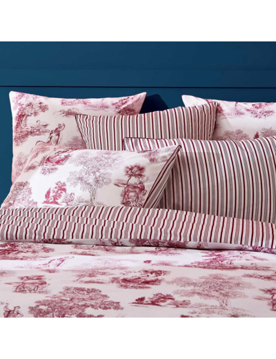 Housse de couette en percale de coton 80 fils/cm², 100% coton, avec motifs de toile de Jouy imprimés en all over. Rayures verticales au verso. Qualité made in France. Linge des Vosges.