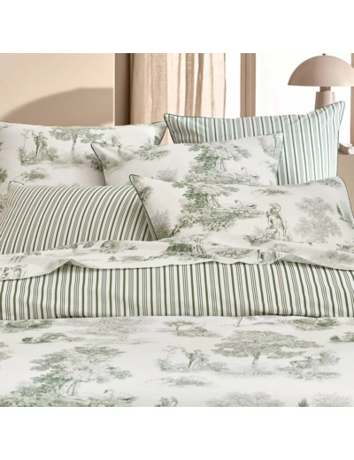 Housse de couette en percale de coton 80 fils/cm², 100% coton, avec motifs de toile de Jouy imprimés en all over. Rayures verticales au verso. Qualité made in France. Linge des Vosges.