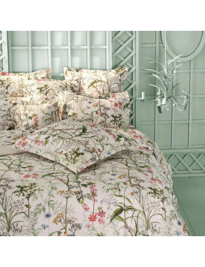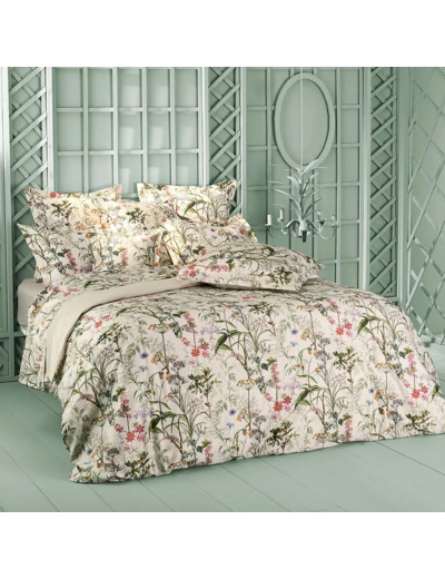Housse de couette imprimée sur satin de coton 120 fils/cm², 100% coton, doux et soyeux. All-over de fleurs des champs sur un fond beige léger, verso Ava uni Lin.