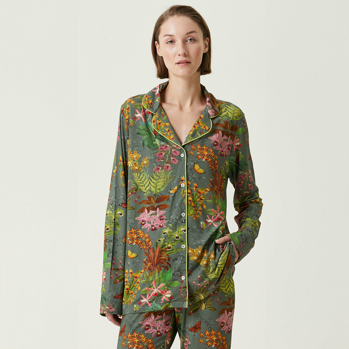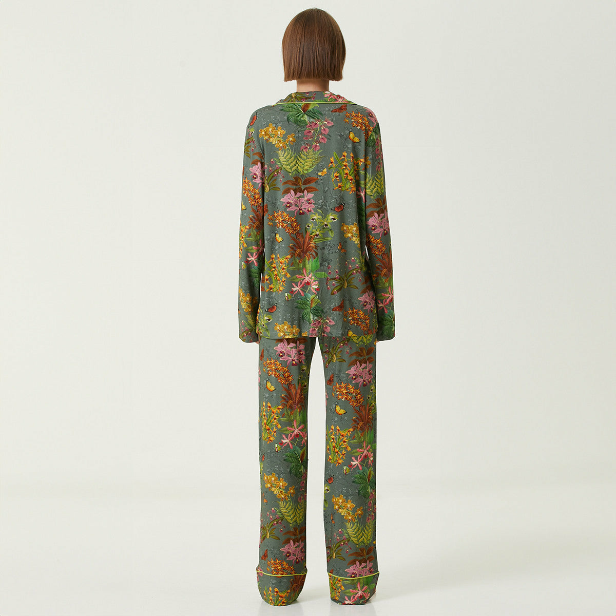 Orchidées et papillons colorés sur un fond gris vert. Veste de pyjama en jersey haut-de-gamme 210 g/m² (95% viscose - 5% élasthanne). Légèrement évasée en bas pour plus d'aisance. Taille élastiquée, coupe droite ample, 2 poches. Veste et pantalon vendus ensemble.