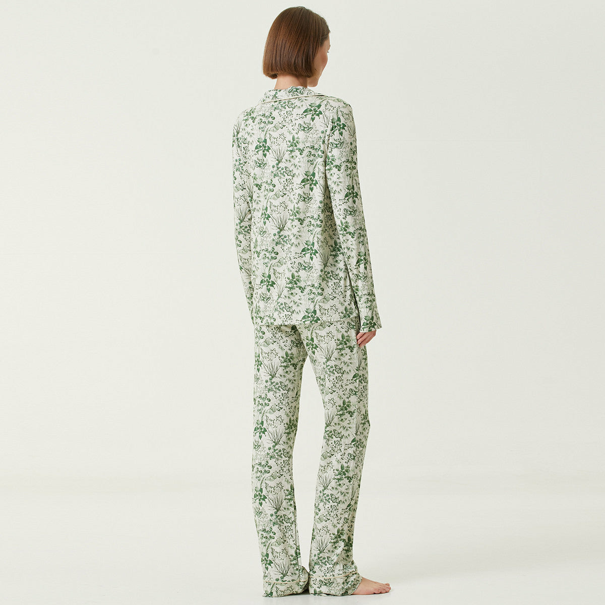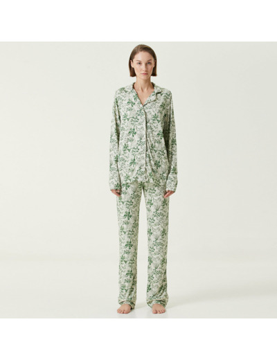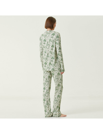 All-over monochrome vert foncé représentant une envolée de papillons au milieu de trèfles et d'herbes sauvages. Veste de pyjama en jersey haut-de-gamme 210 g/m² (95% viscose - 5% élasthanne). Légèrement évasée en bas pour plus d'aisance. Taille élastiquée, coupe droite ample, 2 poches. Veste et pantalon vendus ensemble.