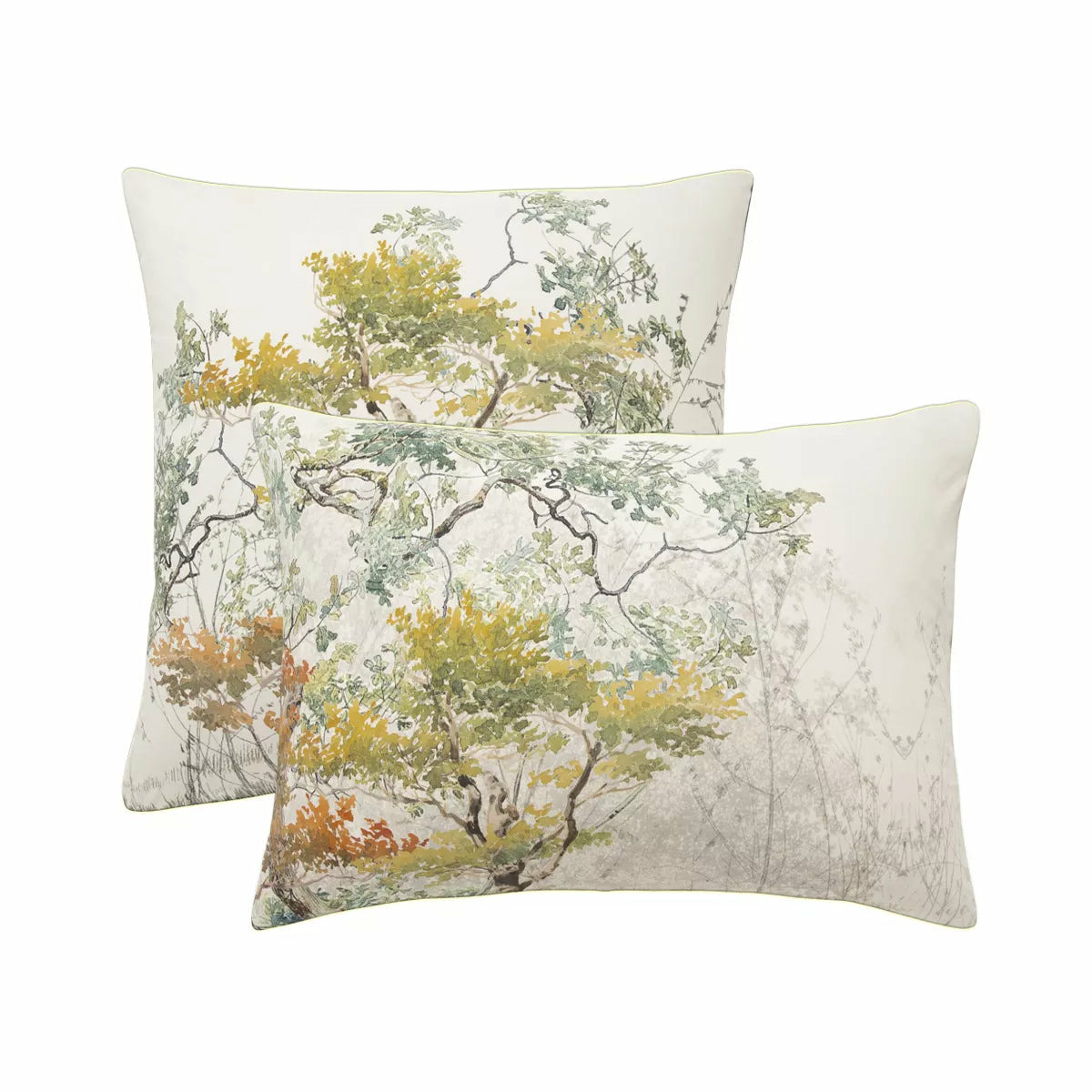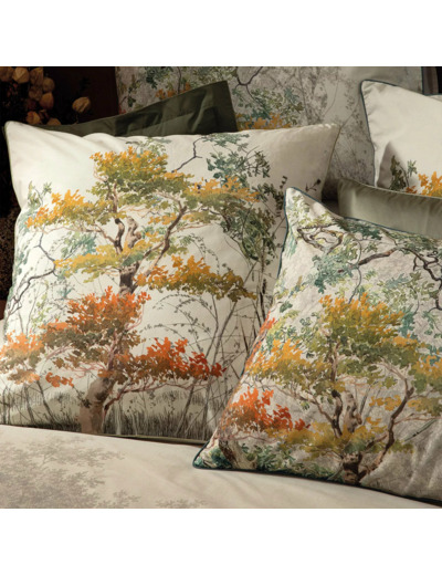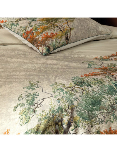 Taie d'oreiller en percale 100% coton 80 fils/cm². Motif placé d'arbres au feuillage automnal. Verso en percale unie coloris beige clair. Produit prélavé : effet froissé permanent, repassage superflu.