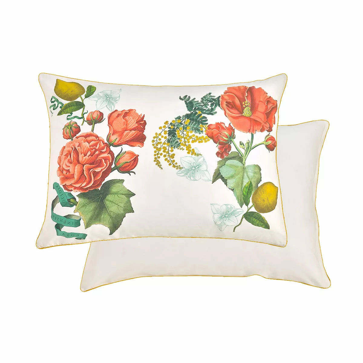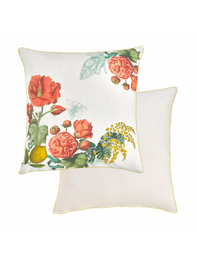 Taie d'oreiller en percale 100% coton 80 fils/cm². Guirlandes de roses anciennes, d'hibiscus, de mimosas et de citrons dans un esprit de dolce vita vintage et intemporel. Verso en percale unie écrue. Produit prélavé : effet froissé permanent, repassage superflu.