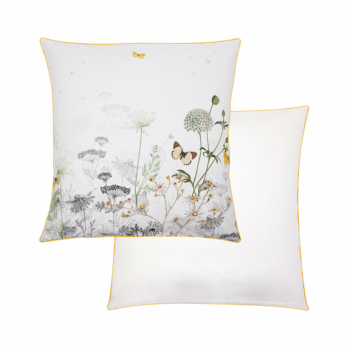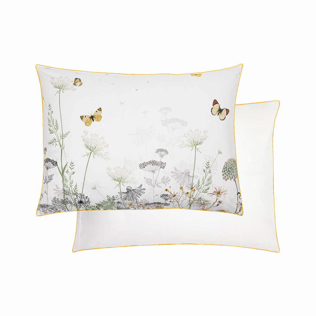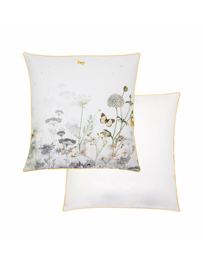 Taie d'oreiller en percale 100% coton 80 fils/cm². Imprimé avec un mélange de fleurs sauvages dessinées au trait et de fleurs colorées. Verso en percale unie blanche. Produit prélavé : effet froissé permanent, repassage superflu.