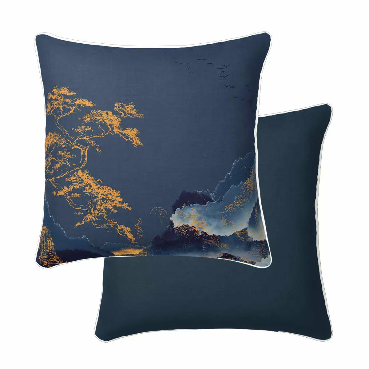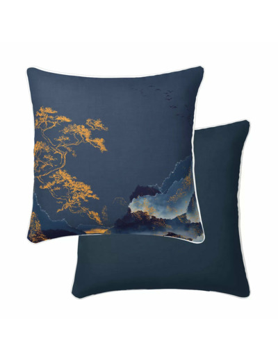 Taie d'oreiller imprimée sur satin de coton 120 fils/cm², 100% coton, doux et soyeux. Paysage mystique représentant des montagnes nimbées de nuages bleutés. Des motifs jaune d'or viennent animer cette composition pleine de poésie.
