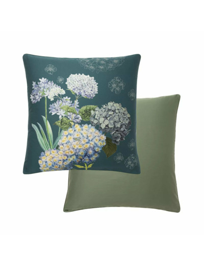 Taie d'oreiller imprimée sur satin de coton 120 fils/cm², 100% coton, doux et soyeux. Motif linéaire d'un massif d'hortensias et d'agapanthes bleus sur un fond canard. Un dessin grandiose dans un camaïeu bleu vert subtil et élégant. Verso satin vert sauge.