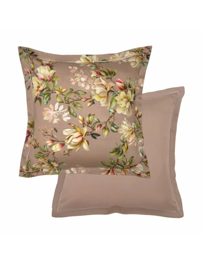 Taie d'oreiller imprimée sur satin de coton 120 fils/cm², 100% coton, doux et soyeux. All-over de branches de magnolias aux tons poudrés et féminins.