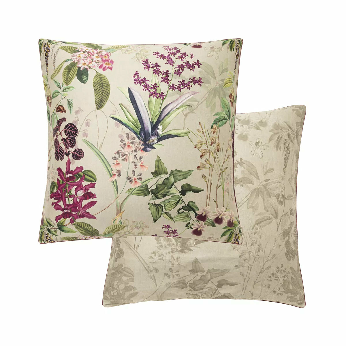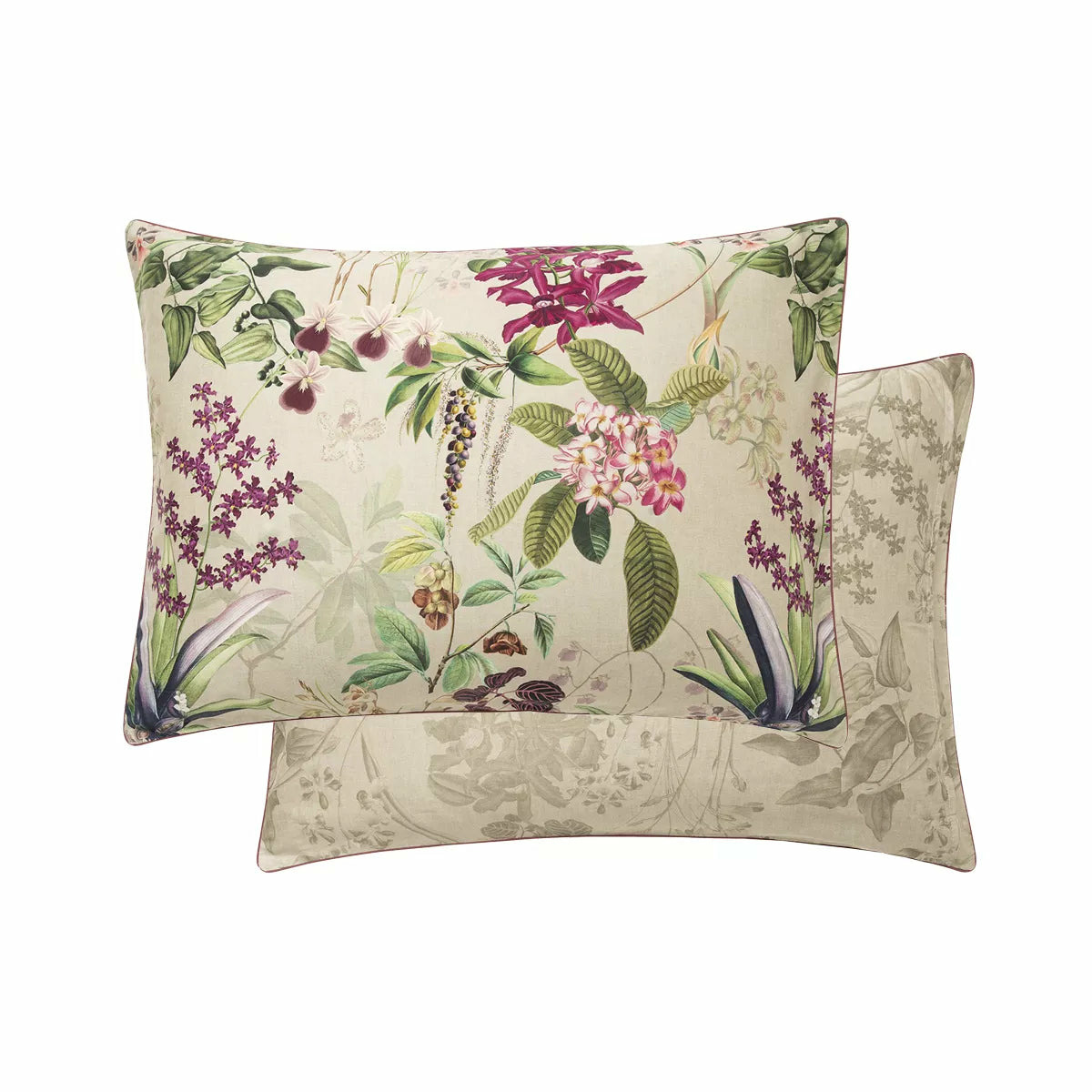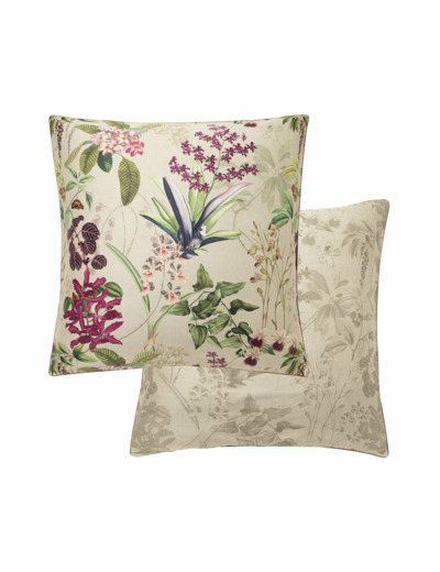 Taie d'oreiller imprimée sur satin de coton 120 fils/cm², 100% coton, doux et soyeux. All-over d'orchidées dans des couleurs sophistiquées et féminines sur un fond grègre texturé. Verso : All-over d'orchidées ton-sur-ton dans un camaïeu de tons grège / taupe délicieusement vintage.