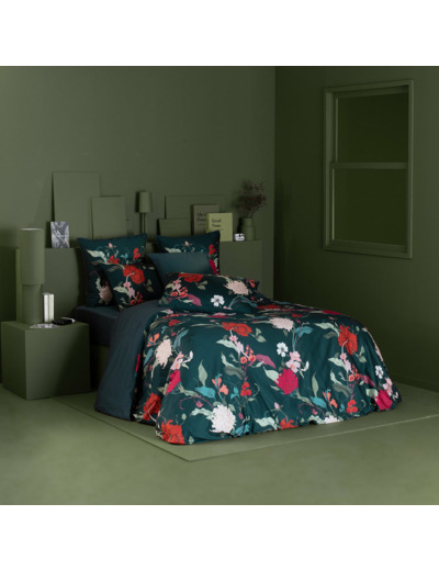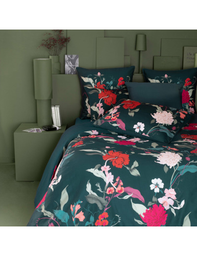 Taie d'oreiller imprimée sur satin de coton 120 fils/cm², 100% coton. Doux et soyeux, le satin donne à ce linge un aspect brillant et lisse. Motif floral placé ; verso en satin uni vert crépuscule.