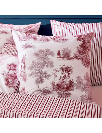 Taie d'oreiller en percale de coton 80 fils/cm², 100% coton, avec motifs de toile de Jouy imprimés en all over. Rayures verticales au verso. Qualité made in France. Linge des Vosges.