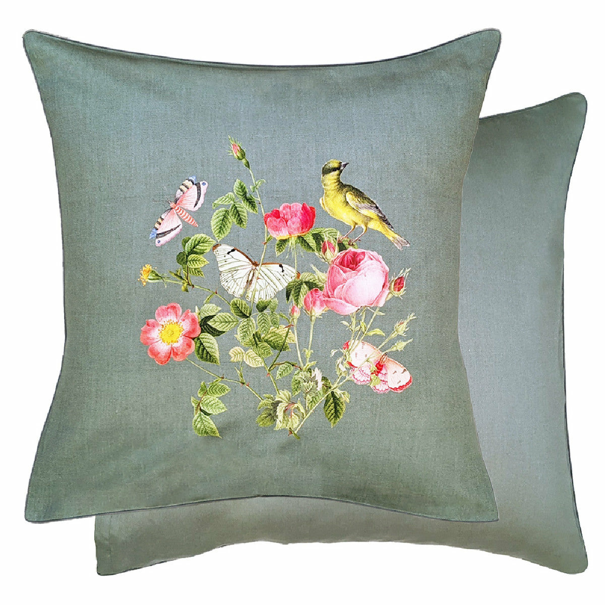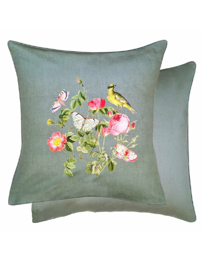 Taie d'oreiller imprimée sur satin de coton 120 fils/cm², 100% coton, doux et soyeux. Recto imprimé (motif placé sur les taies carrées, all over sur les taies rectangulaires), satin uni gris vert au verso.