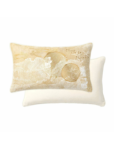Taie d'oreiller imprimée sur satin de coton 120 fils/cm², 100% coton, doux et soyeux. Paysage onirique traité dans l'esprit des estampes Japonaises, baigné d'une lumière dorée et précieuse.