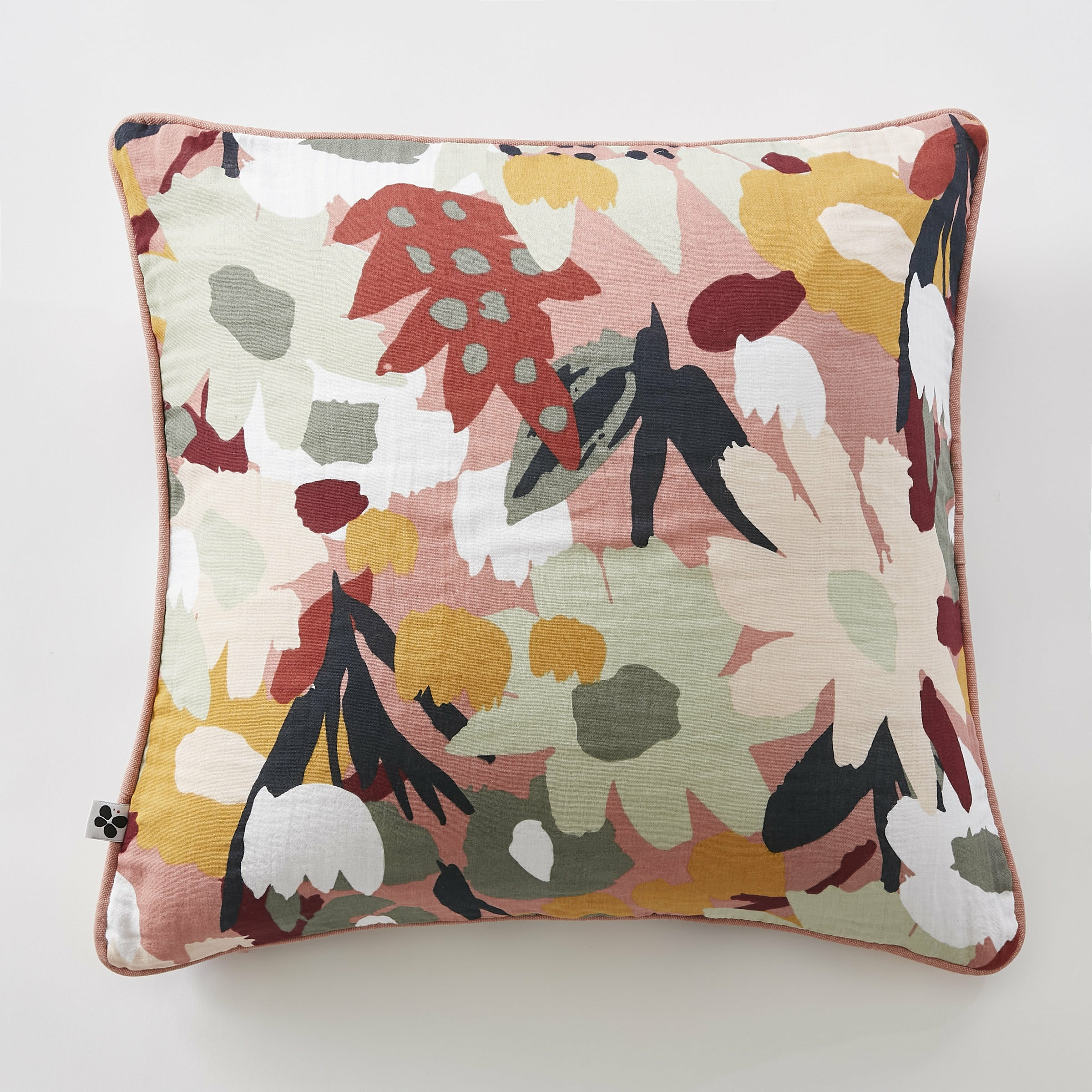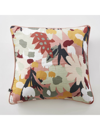 Coussin déhoussable avec passepoil en gaze de coton imprimée, disponible en carré et rectangle. Housse 100% Coton, garnissage 100% Polyester.