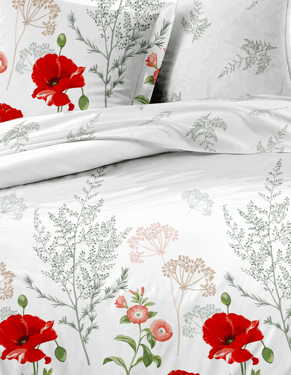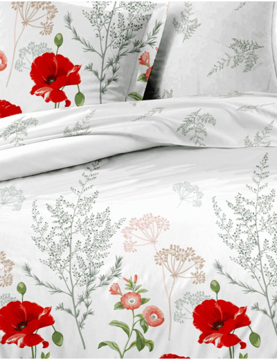 Apportez une touche de fraîcheur printanière à votre chambre avec notre collection AURORE en percale de coton, ornée de motifs floraux avec des coquelicots rouges sur la face et des brins de fleurs sur l'envers. Transformez votre espace en un véritable jardin poétique.