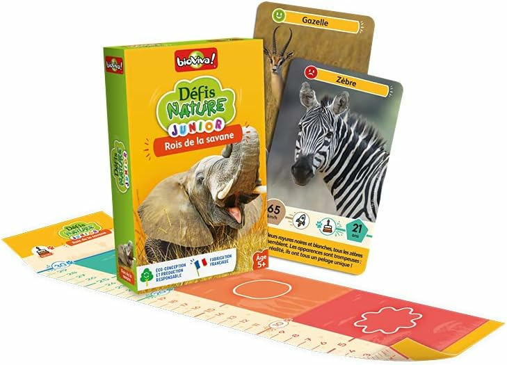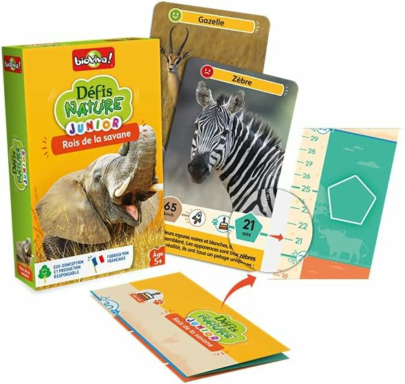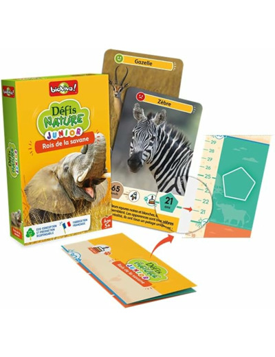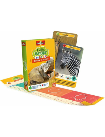 Avec Défis Nature Junior, partez à la rencontre des rois de la savane. Observez vos animaux, comparez leurs caractéristiques en vous aidant de la toise et remportez le maximum de cartes ! De 2 à 6 joueurs. Dès 5 ans. Fabriqué en France.