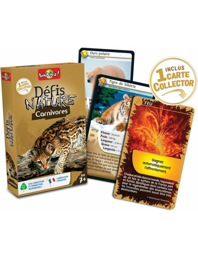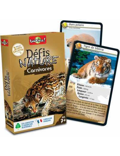 Pariez sur les points forts des animaux et retournez la situation à l'aide de vos espèces menacées. Le joueur qui, au final, présente la plus forte caractéristique remporte les cartes des autres joueurs. Le premier à collecter toutes les cartes du jeu gagne la partie. A partir de 7 ans. Jeu fabriqué en France et éco-conçu.