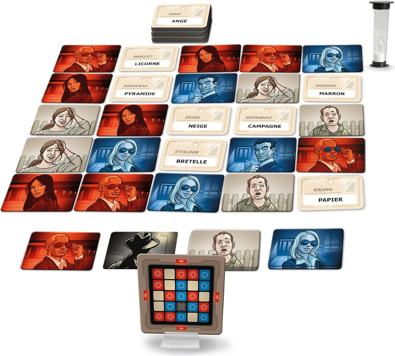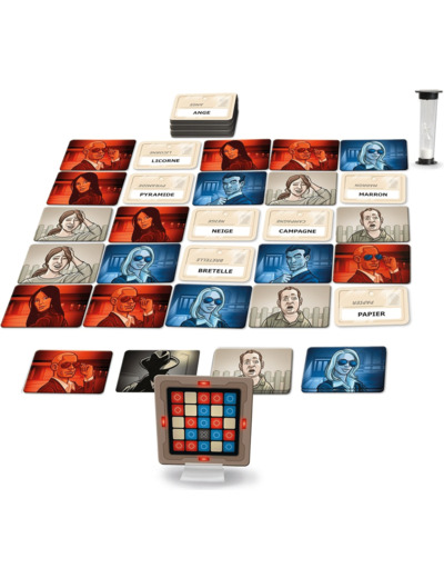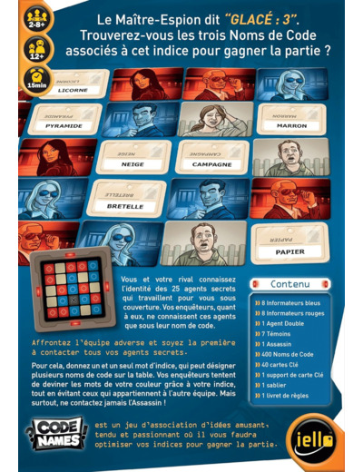 8 tuiles Enquêteur bleu, 8 tuiles Enquêteur rouge, 1 tuile Agent Double, 7 tuiles Témoin, 1 tuile Assassin, 200 cartes Nom de Code, 40 cartes Clé, 1 support de carte Clé et 1 livret de règles