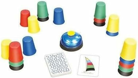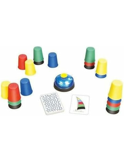 24 cartes, 20 gobelets, sonnette, règle du jeu.