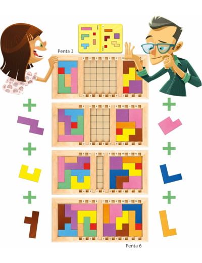 plateau de jeu, 2 réglettes en bois, 18 pièces en bois, 18 cartes Penta, 21 planches d'exemples, règle du jeu détaillée.