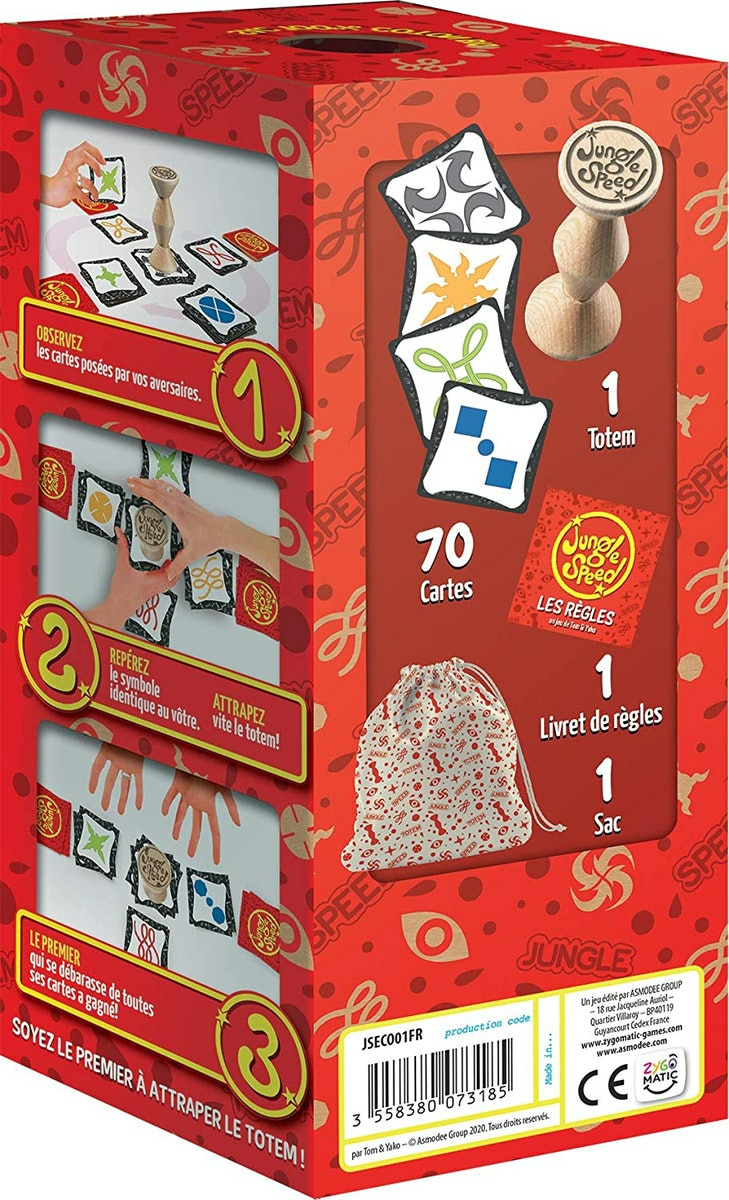 Jungle Speed Classique est un jeu de société d'action et de réflexes qui combine des éléments de vitesse, d'observation et de mémoire. L'objectif de Jungle Speed est d'être le premier joueur à se débarrasser de toutes ses cartes en obtenant correctement les motifs correspondants à celles des autres joueurs. Le jeu comprend un ensemble de cartes rondes, chacune arborant divers motifs (symboles, couleurs, formes) et une totem en bois placée au centre de la table. Le totem sert de déclencheur pour le jeu. Les joueurs s'assoient en cercle autour de la table. Chacun reçoit un ensemble de cartes qu'il conserve face cachée. Les cartes sont placées à proximité du joueur, prêtes à être jouées. Les joueurs prennent des cartes une par une et les placent au centre de la table, créant une pile. Dès qu'un motif correspondant apparaît entre deux joueurs, ils doivent tous les deux se précipiter pour attraper le totem au centre de la table. Celui qui attrape le totem en premier doit donner toutes ses cartes face cachée à l'autre joueur. Le joueur qui a reçu les cartes doit les ajouter à son propre jeu.