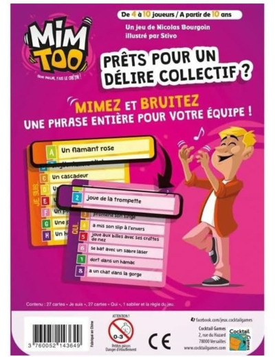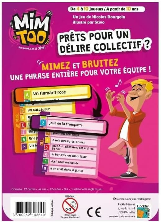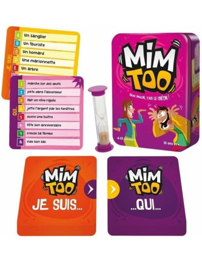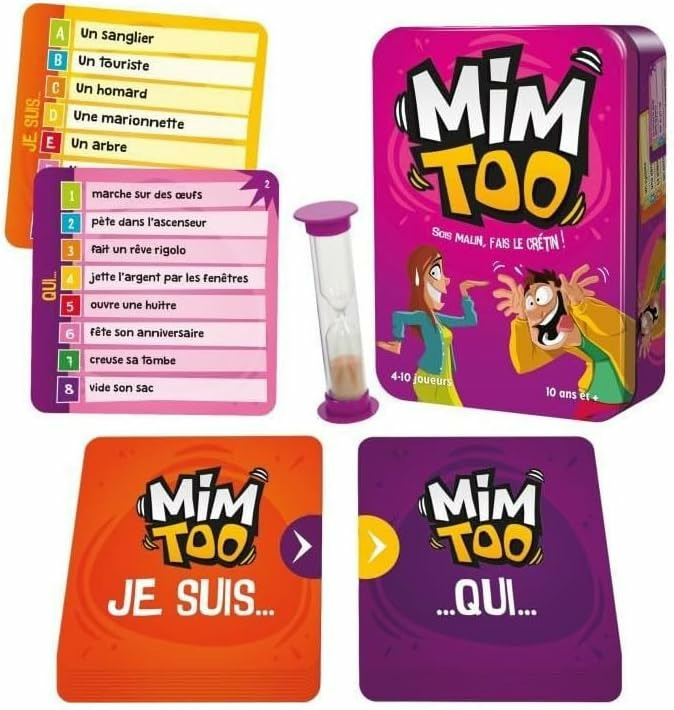 Mimtoo et Mimtoo Famille sont de retour, encore plus beaux et délirants Le principe est le même : vous devez mimer à vos partenaires des scènes très insolites, après avoir tiré une carte dans deux pioches différentes. La première carte vous indique le sujet (par exemple un cheval ) et la seconde, l’action que ce dernier est en train d’effectuer ( fume un cigare par exemple). Si vous parvenez à tout faire deviner à votre équipe avant la fin du sablier, vous marquez les points indiqués sur les cartes Ces nouvelles éditions proposent plus d’expressions à mimer : 432 contre 300, donc encore plus de combinaison à mimer (22000 avant, contre plus de 46000 maintenant ). Les visuels ont fait l’objet d’un coup de neuf et les règles d’un rafraichissement.
