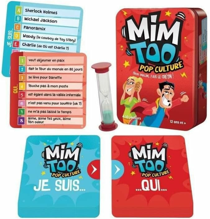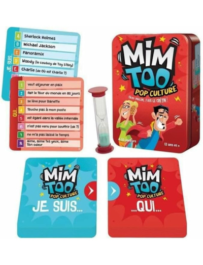 Mimtoo: Pop Culture, distribué par Asmodee et créé par Cocktail Games, vous embarque dans une aventure palpitante au cœur de la culture populaire. Ce jeu d'ambiance dynamique est conçu pour 4 à 10 joueurs âgés de 12 ans et plus, offrant une expérience immersive et rythmée.Dans Mimtoo: Pop Culture, les joueurs sont invités à faire preuve d'ingéniosité et d'un brin de folie en mimant et en bruitant des phrases variées qui leur donneront du fil à retordre. Avec des centaines de références hilarantes à deviner, chaque partie est une occasion de mettre en valeur ses talents de mime et de devinette.Mimtoo: Pop Culture garantit un divertissement instantané pour les joueurs de tous âges et niveaux, avec des règles simples à comprendre et une durée de jeu de seulement 15 minutes. Que vous soyez un aficionado de la culture pop ou un novice, ce jeu saura vous séduire.Vous pouvez également découvrir les versions Mimtoo Original et Mimtoo Famille pour explorer différentes thématiques de jeu et varier les plaisirs. Avec Mimtoo, il y en a pour tous les goûts et toutes les occasions de jeu.En résumé, Mimtoo: Pop Culture est bien plus qu'un simple jeu de société. Il offre une expérience ludique et divertissante, idéale pour partager des moments de rire et de complicité entre amis ou en famille. Si vous recherchez un jeu où l'originalité et la créativité sont à l'honneur, Mimtoo: Pop Culture est fait pour vous !