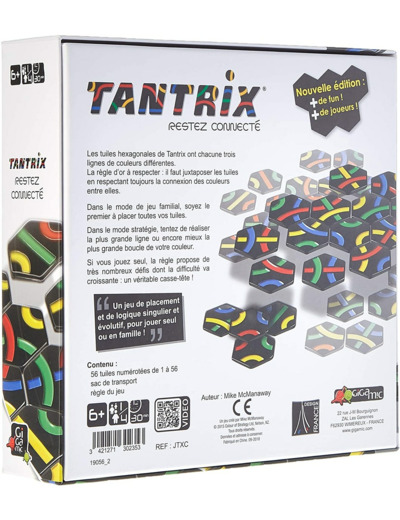les tuiles hexagonales ont chacune trois bandes de couleurs différentes qu'il faut connecter en respectant la correspondance des couleurs entre elles. En solitaire, il s'agit d'un casse-tête évolutif qui vous promet de nombreuses heures de réflexion. En collectif, chacun se concentre sur sa propre couleur et essaie de réaliser la ligne La plus longue tout en contrant celles des adversaires. Alors, prêt à affronter la logique de Tantrix?