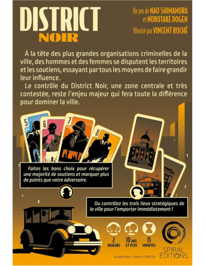 Dans les plus grandes organisations criminelles de la ville, des hommes et des femmes s'affrontent pour faire grandir leur influence.Le contrôle du District Noir, une zone très contestée, est un enjeu majeur et primordial pour dominer la ville. Vous cherchez un jeu de société qui mettra à l'épreuve vos compétences tactiques et votre capacité à prendre des décisions ? Ne cherchez pas plus loin que District Noir ! Ce jeu de bluff passionnant vous met au défi de gérer votre main de cartes de manière stratégique, en les posant au bon moment pour déjouer votre adversaire. Mais District Noir n'est pas qu'une question de stratégie - c'est aussi un jeu de prise de risque et de bluff. Pouvez-vous convaincre votre adversaire de faire les mauvais choix, tout en évitant d'être victime de ses propres ruses ? Dans District Noir, chaque geste compte. Mettez vos compétences à l'épreuve et voyez si vous avez ce qu'il faut pour sortir vainqueur. Que vous soyez un habitué des jeux de société ou que vous débutiez, District Noir vous tiendra en haleine.