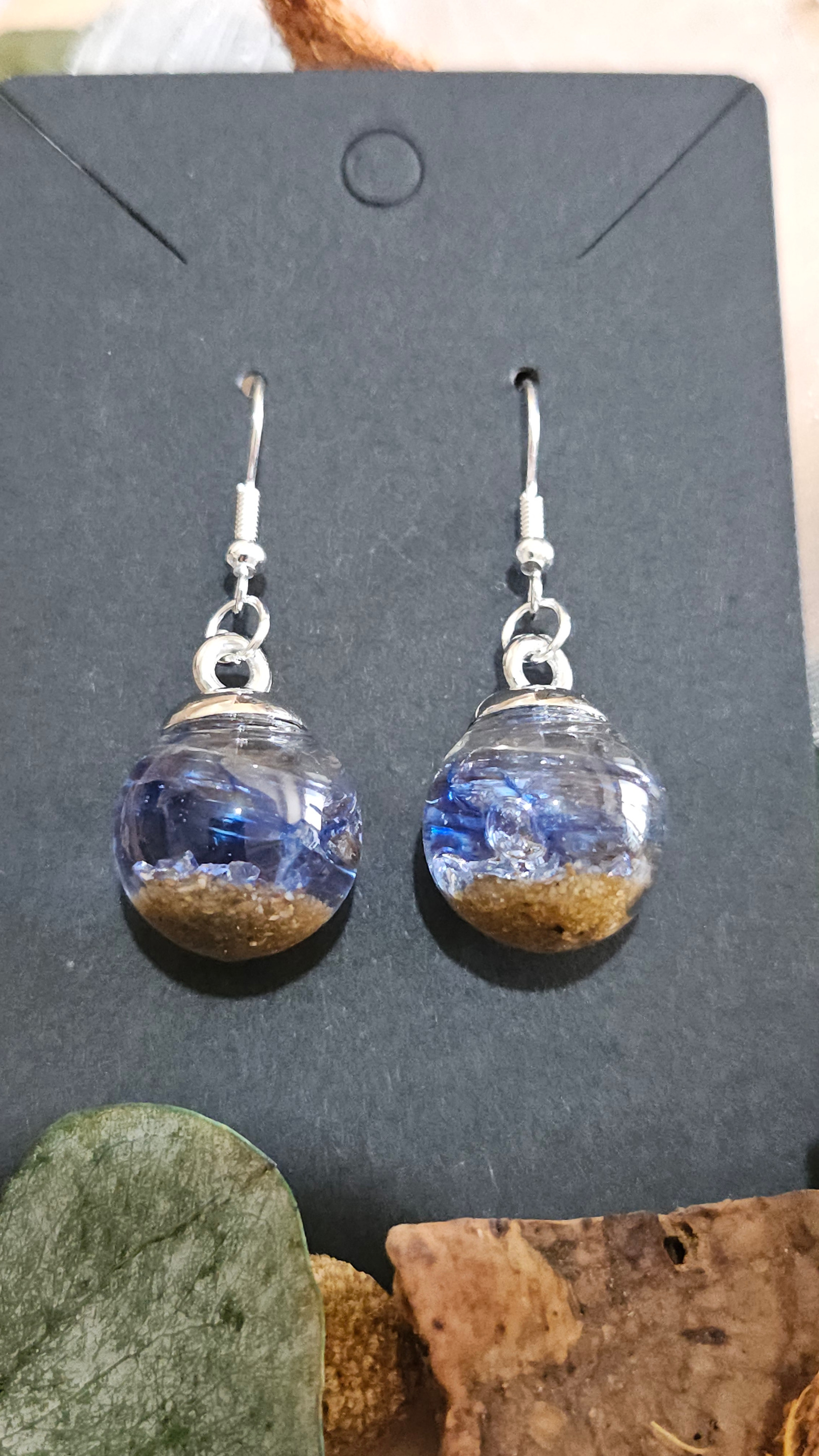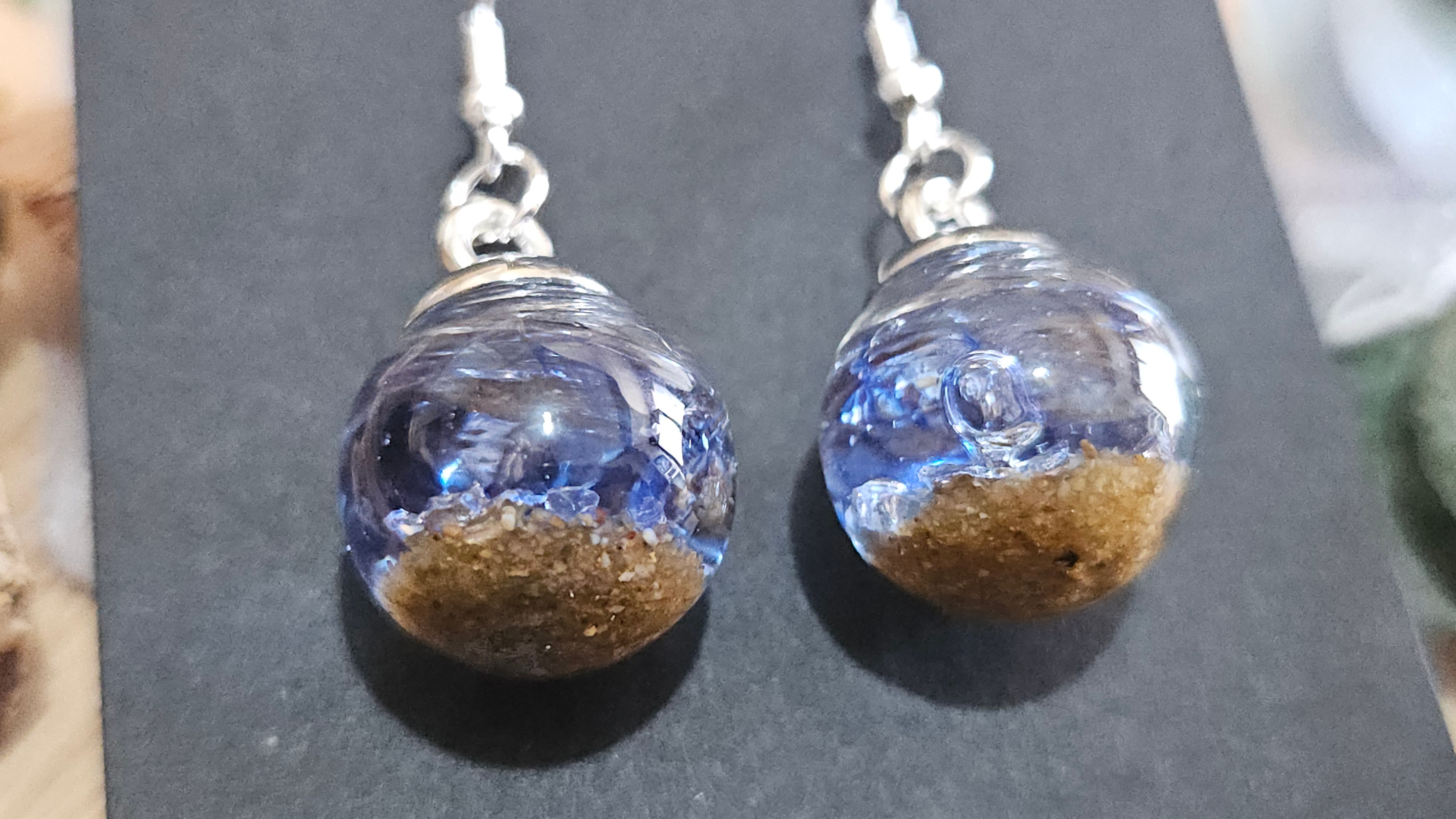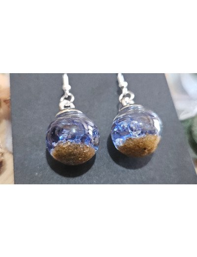 Les pendentifs en forme de bulles de verre cristallines renferment un petit univers unique : dans le cas présent, sable, cailloux et mer