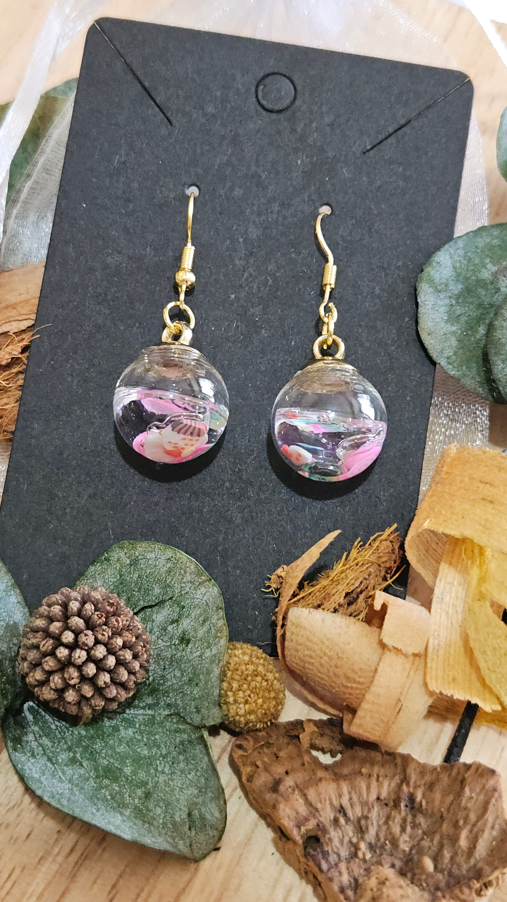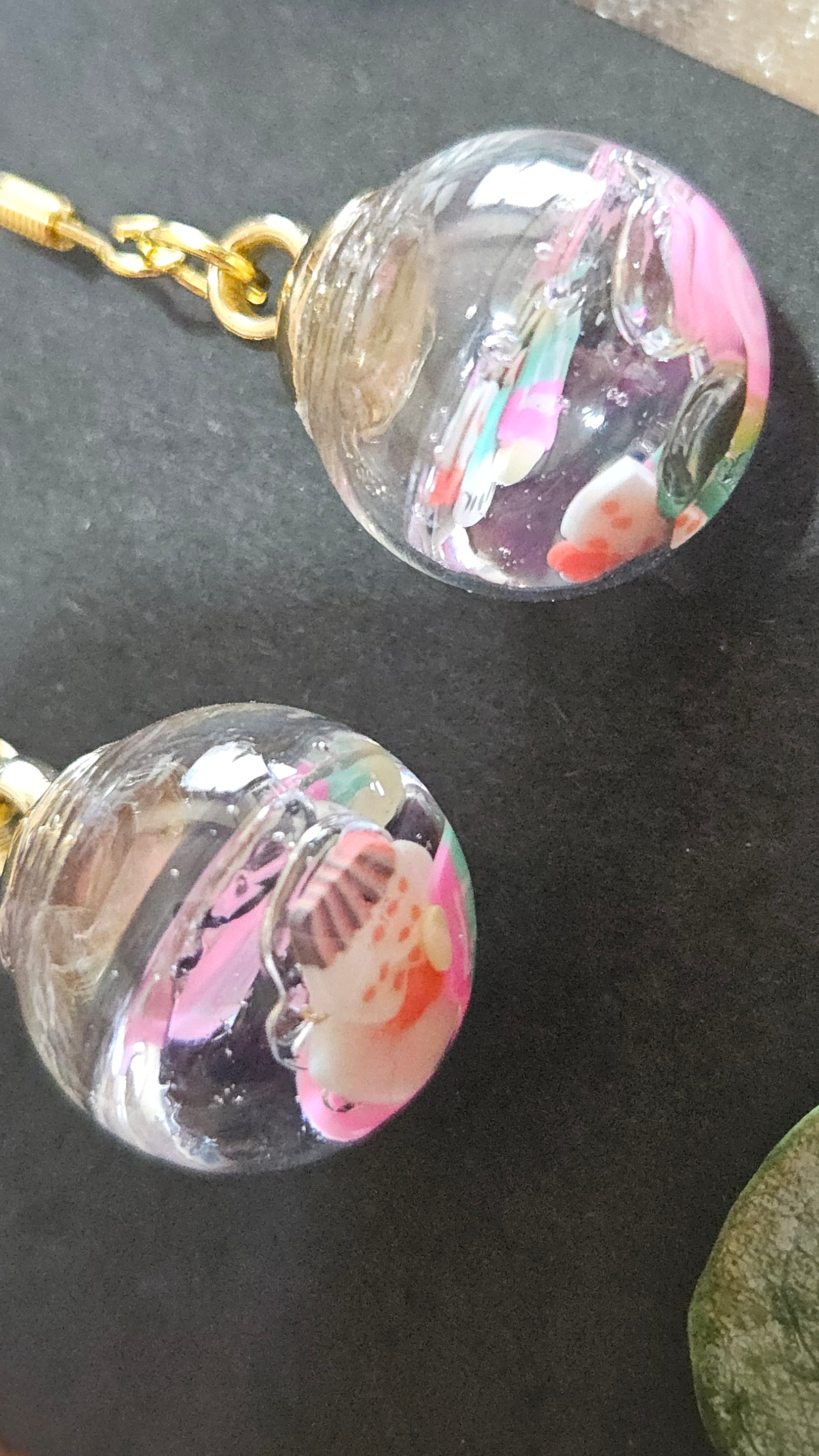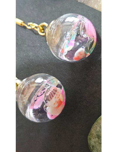 Les pendentifs en forme de bulles de verre cristallines renferment un petit univers unique : dans le cas présent, des gâteaux et friandises.