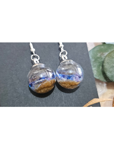 Les pendentifs en forme de bulles de verre cristallines renferment un petit univers unique : dans le cas présent, sable, perles et mer.