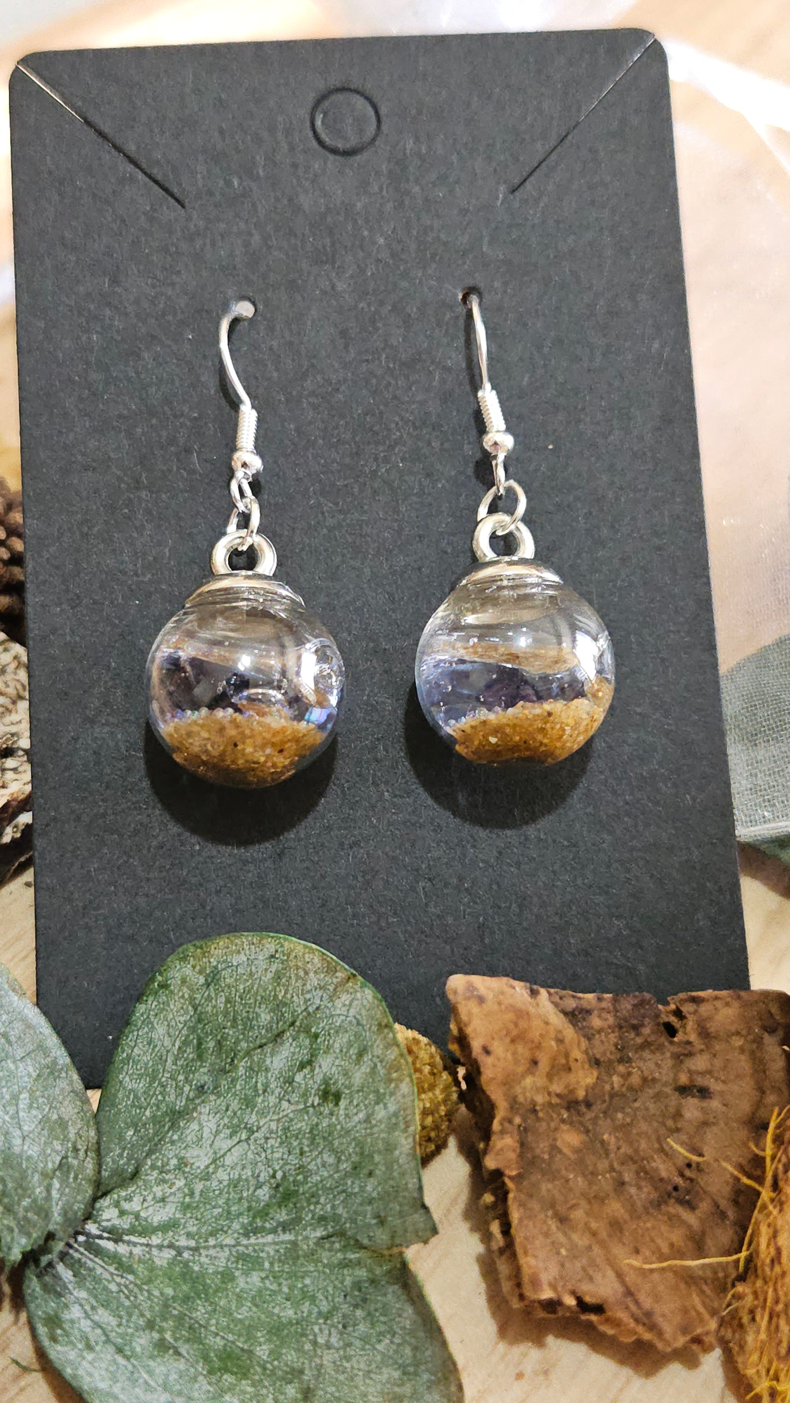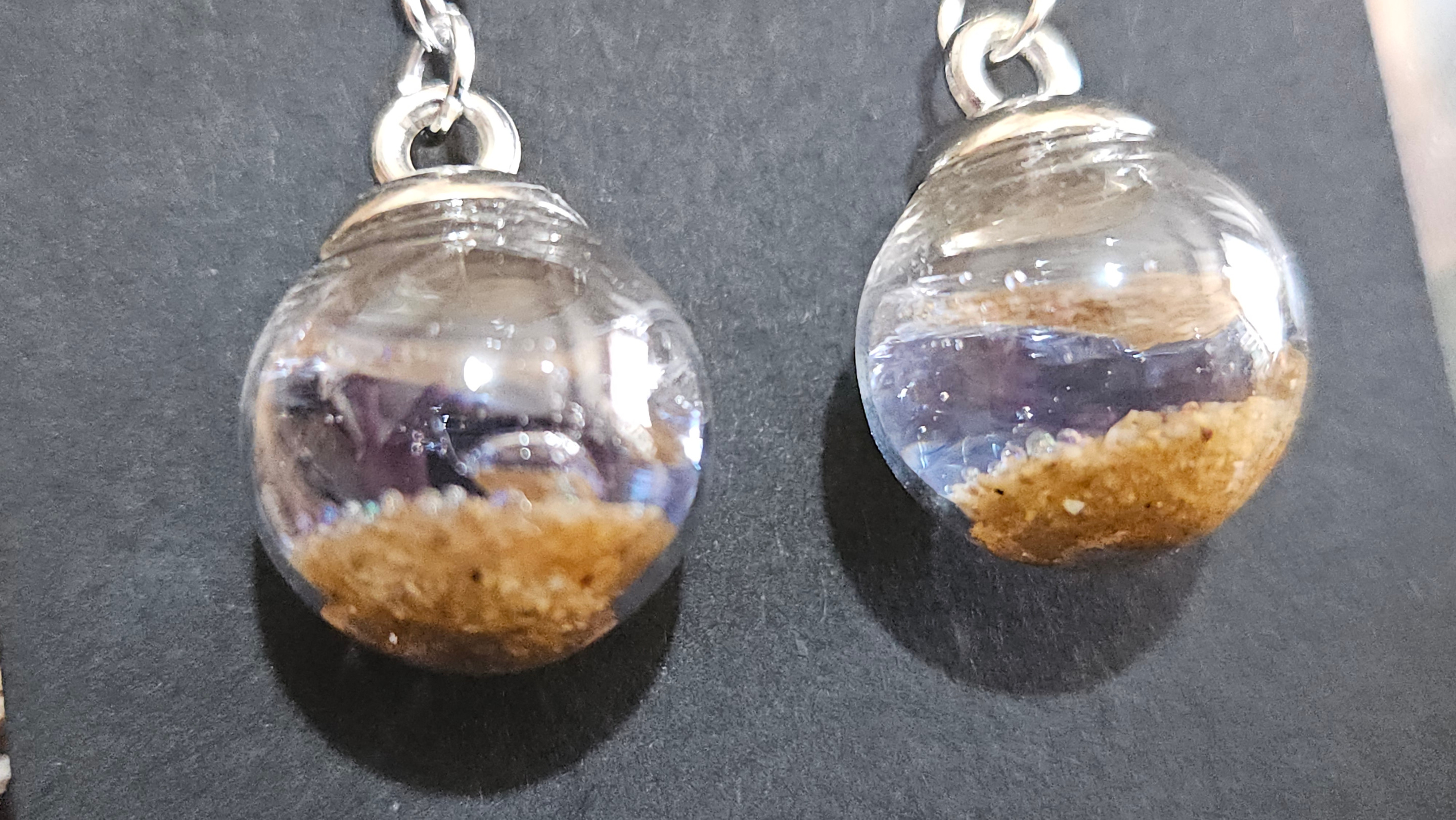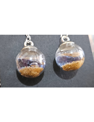 Les pendentifs en forme de bulles de verre cristallines renferment un petit univers unique : dans le cas présent, sable, perles et mer