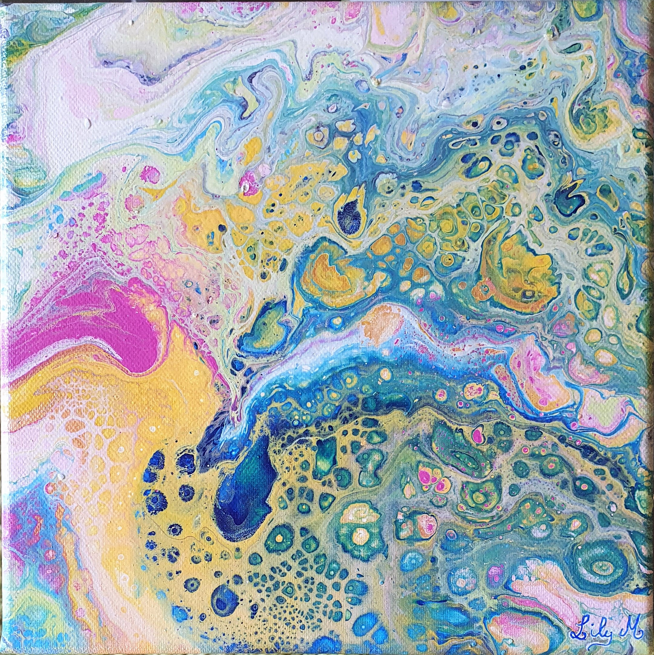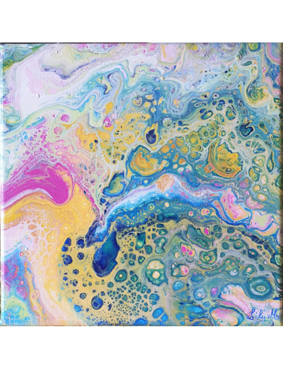 Réalisée selon la technique fascinante du pouring (coulage acrylique), ce tableau est une explosion de couleurs qui se mêlent pour former un motif abstrait et organique. N'y voyez-vous pas un bassin de nymphéas vous aussi ?